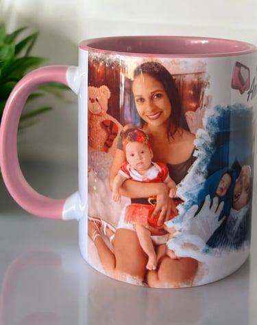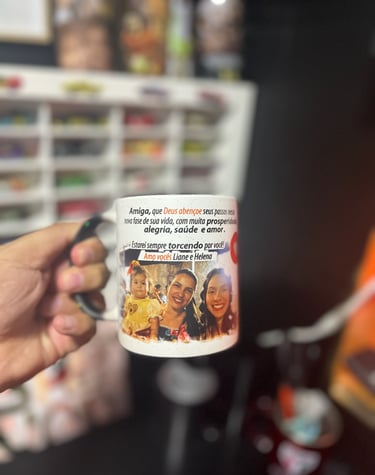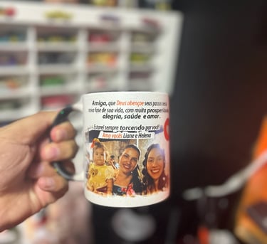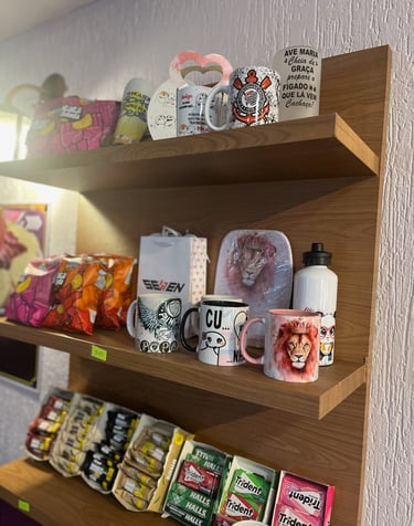 Oferecemos uma ampla gama de produtos personalizados, como canecas, mouse pads e itens para festas.